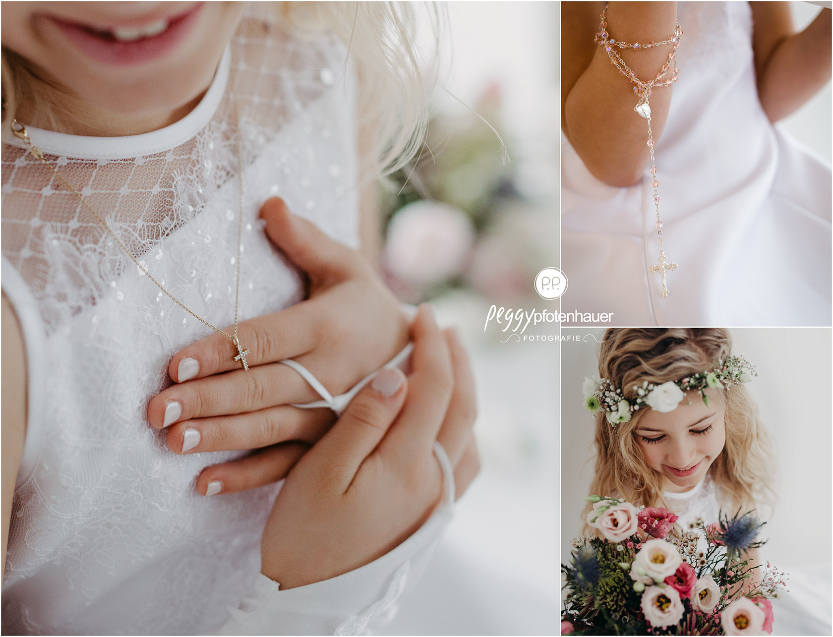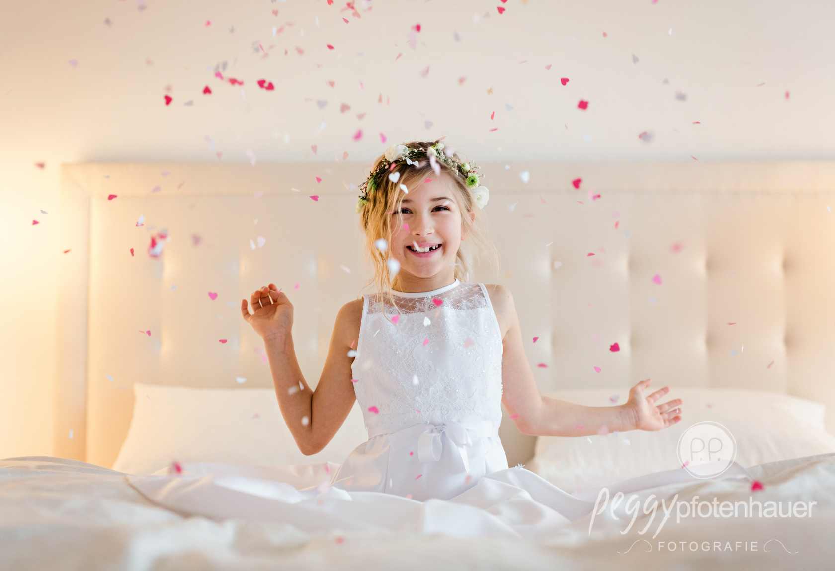 Eine Mischung aus etwas ausgefalleneren, auf keinen Fall langweiligen und doch auch klassischen Kommunionsfotos, auf jeden Fall aber mit ganz viel „Mädchenspirit“, sollte es werden. Und so shooteten wir fast einen ganzen Vormittag lang im Haus der Familie und hatten jede Menge Spaß dabei.